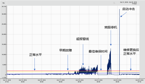 如下圖所示,某機床通過振動分析,可以看到10月18日振動加速度峰值觸發(fā)早期預警閾值,但是由于生產(chǎn)計劃問題,沒有停機維護;10月22日機床主控系統(tǒng)觸發(fā)故障,不得不停機過10個小時維修和更換軸承,維修后,振動恢復正常水平,但較大損失已經(jīng)造成。