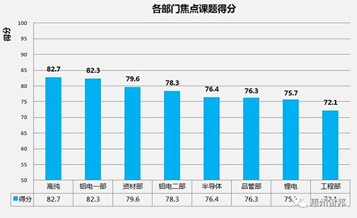 本次課題評比通過組長現(xiàn)場演講,評委現(xiàn)場打分的方式進(jìn)行,評委組成有:周總、李總、秦總、孫總、楊總、各部門經(jīng)理、顧問老師。經(jīng)過各課題組長的演講,展示課題的開展過程與成果,以及評委根據(jù)評分標(biāo)準(zhǔn)進(jìn)行評價(jià)打分,高純化學(xué)品部課題-《提高LT113干燥的合格率》獲得第一名,鋁電一部課題-《縮短LT65的干燥時(shí)間》獲得第二名,資材部課題-《提高銅蝕刻液噸桶清洗的一次合格率》獲得第三名。各部門課題得分如下: