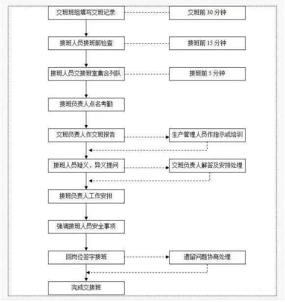 用記錄和口述方式,真實詳細地向接班者交清當班安全、環(huán)保、生產(chǎn)和設備運行狀況、操作體會、注意事項,發(fā)現(xiàn)問題或隱患,主管指示等,如當班有事故或異常情況發(fā)生過,必須要講解事故或異常情況發(fā)生經(jīng)過、可能的原因、事故損失情況、事故的處理情況和經(jīng)驗教訓等內(nèi)容,交班者應在現(xiàn)場說清楚。交班者應如實向接班者反映生產(chǎn)狀況,接班者應認真、仔細檢查生產(chǎn)各方面是否正常,做到交接班清楚。