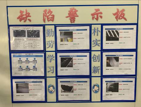 在標(biāo)注化車間管理者工作的同時(shí),為確保質(zhì)量,在上片處建立了“來料缺陷墻”以及裝箱處建立了“質(zhì)量警示墻”,確保投料階段,不流入不良品,裝箱階段,不流出不良品;同時(shí),在成型及后處理段,結(jié)合工藝及質(zhì)量,編制了各崗位”檢驗(yàn)基準(zhǔn)書“,確保過程,不生產(chǎn)不良品。