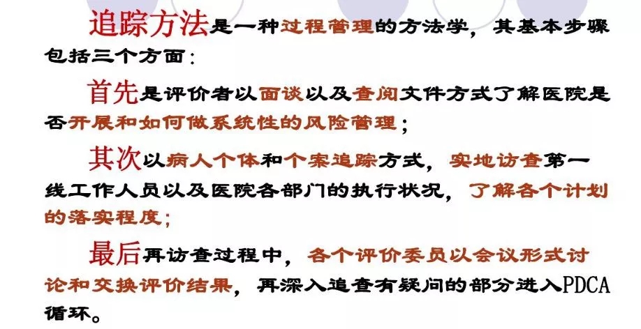 追蹤方法學(xué)是近年來國(guó)際醫(yī)院評(píng)價(jià)中出現(xiàn)的一種體現(xiàn)以病人為中心的評(píng)價(jià)方法,2004年由美國(guó)聯(lián)合評(píng)審委員會(huì)(JCAHO)引入的一種新的評(píng)審方式。