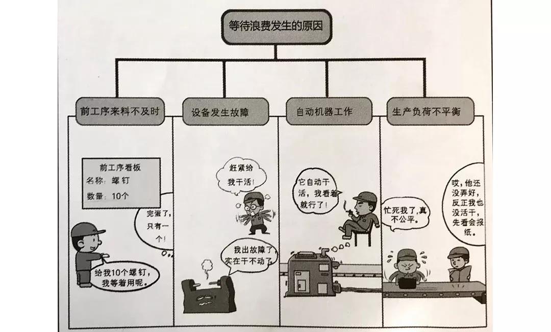 在加工、搬運、檢查過程中,隨處可見等待的現(xiàn)象。例如,前工序來料不及時、設(shè)備發(fā)生故障、自動機器工作、生產(chǎn)負(fù)荷不平衡等,都是等待浪費發(fā)生的高危時段。
