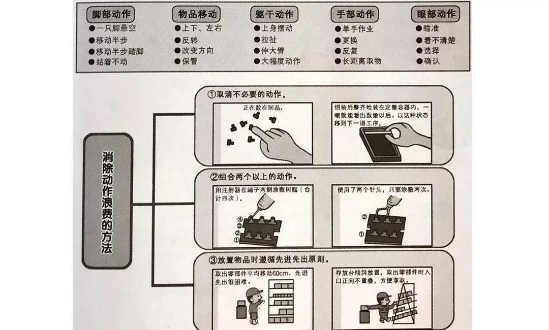 在生產(chǎn)過程中,人和設(shè)備的動作中只要不產(chǎn)生附加價值,都可稱為動作浪費。例如,單手空閑、作業(yè)動作突然停止、作業(yè)動作過大、左右手交換、步行過多、轉(zhuǎn)身的角度太大、移動中變換“狀態(tài)”、伸背彎腰動作以及重復(fù)動作等,這些不合理的動作造成了時間和體力上的不必要消耗,都是動作浪費。消除動作浪費的三個主要改善方向為:①取消不必要的動作;②組合兩個以上的動作;③放置物品時遵循先進(jìn)先出原則。