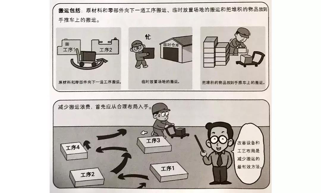 搬運動作遍及生產(chǎn)活動中的各個流程,包含放置、堆積、移動、整理等動作,但是搬運并不能產(chǎn)生附加價值,所以它本身就被認(rèn)為是一種浪費。搬運包括原材料和零部件向下-道工序搬運、臨時放置場地的搬運和把堆積的物品放到手推車上的搬運。其中,設(shè)備布局不合理、生產(chǎn)線布局不合理、工序流程不合理等是造成搬運浪費的主要因素。因此,要想消除搬運浪費,首先應(yīng)從合理布局入手,盡可能減少搬運。