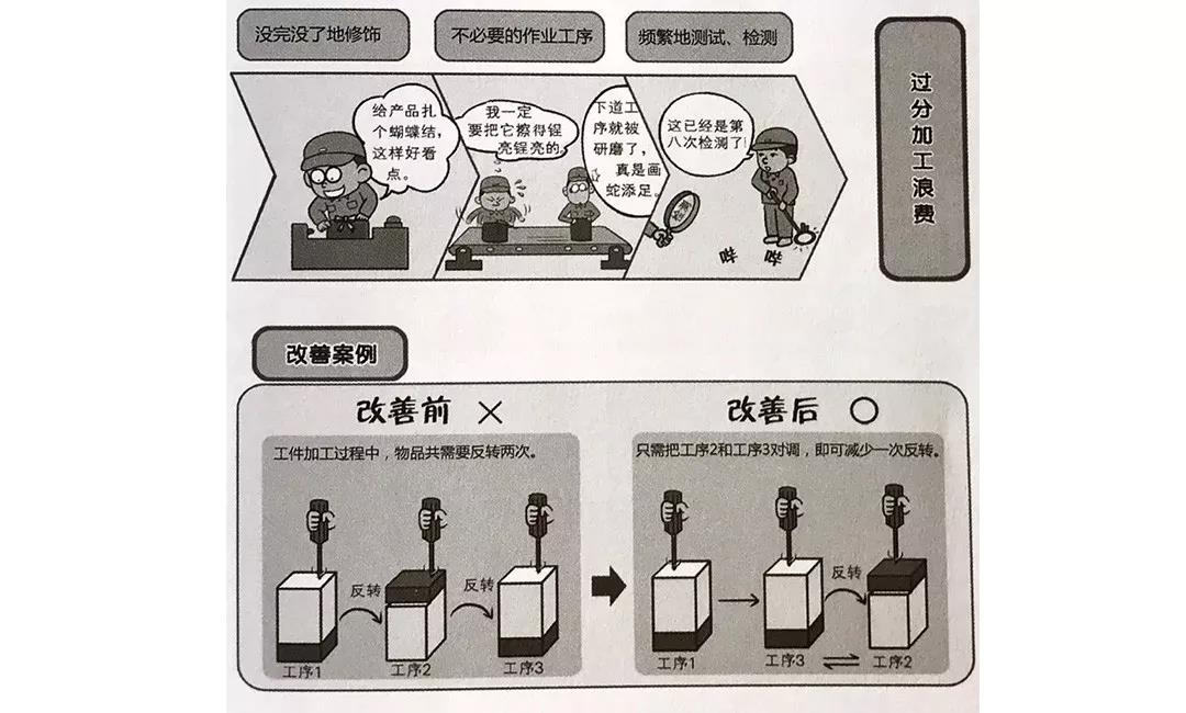 過分加工浪費是指加工質(zhì)量或精度超過了下道工序需求或客戶需求而造成的過度加工的浪費。例如,沒完沒了地修飾,頻繁地測試、分類、檢測。這些白白浪費了過多的工時、原材料和設(shè)備損耗等。在降低過度加工浪費的過程中可以對一些工序可以省略、合并或簡化等。