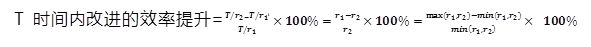 對時間縮短從而效率得到提升,我們可以通過這樣的方法推導(dǎo)公式。原來單位產(chǎn)品的生產(chǎn)節(jié)拍r2,改進(jìn)后的生產(chǎn)節(jié)拍(可以知道r1<r2);原來一定時間內(nèi)的產(chǎn)量T/r1,現(xiàn)在一定時間內(nèi)的產(chǎn)量是T/r2;