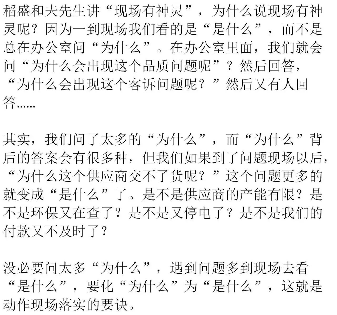 當(dāng)然,辦公室也不是說就不是現(xiàn)場。我們有些工作確實(shí)需要在辦公室來解決,這個(gè)辦公室也是現(xiàn)場,總之就是哪里有問題的地方你就到哪里去,也就是要到問題當(dāng)中去。