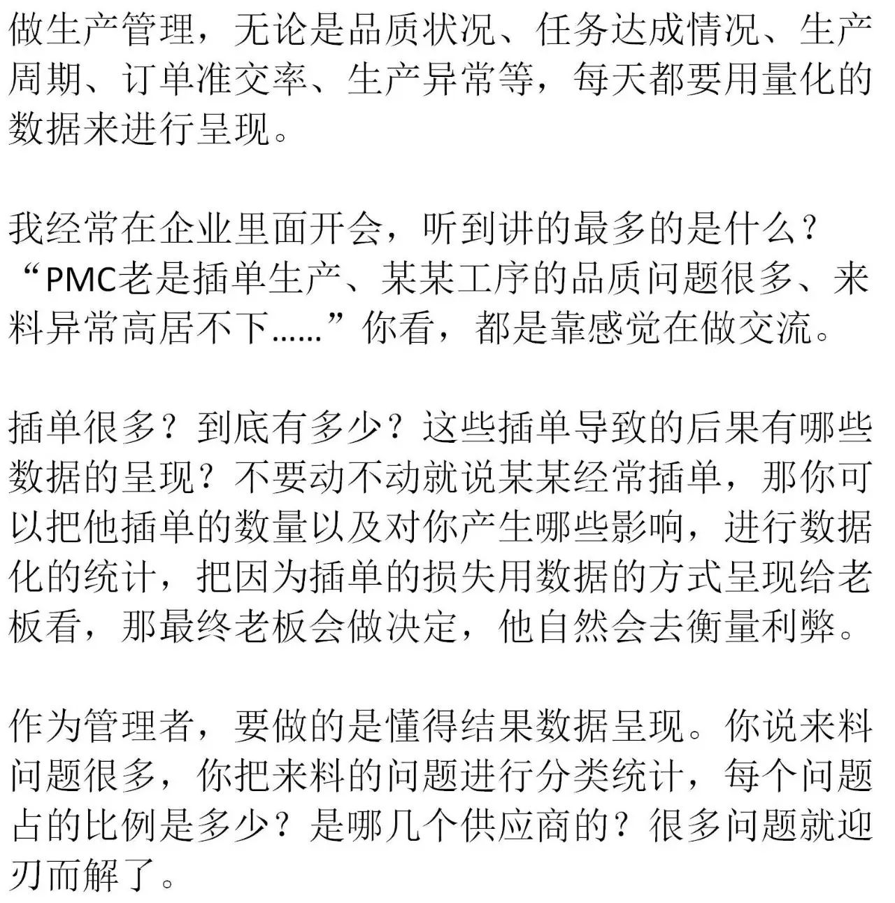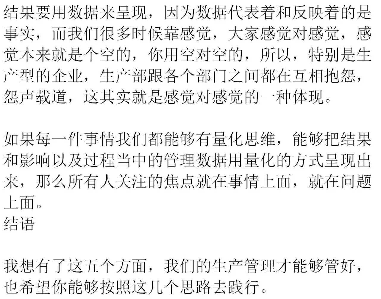 最后,總結(jié)一下,做好制造型企業(yè)生產(chǎn)管理你需要爛熟于心的30字要訣:任務(wù)不斷細(xì)化、物資提前排查、異常快速處理、動(dòng)作現(xiàn)場落實(shí)、結(jié)果數(shù)據(jù)呈現(xiàn)。