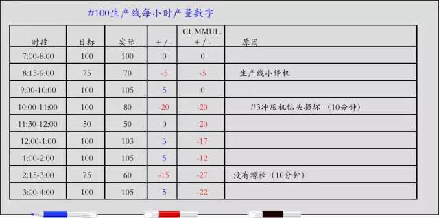 以可視化看板的方式展示每小時生產(chǎn)進(jìn)度目標(biāo)和實(shí)際達(dá)成,可以向所有人傳達(dá)生產(chǎn)線運(yùn)行好壞的信息,以及相關(guān)的影響因素,督促管理層關(guān)注并及時采取行動改進(jìn)。