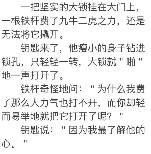 每個人的心,都像上了鎖的大門,任你再粗的鐵棒也撬不開。唯有關懷,才能把自己變成一只細膩的鑰匙,進入別人的心中,了解別人。