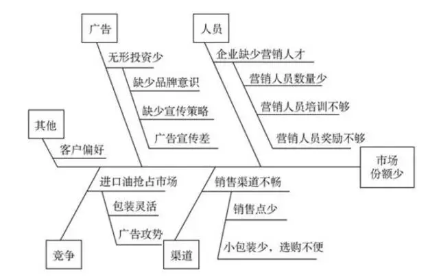 圖中的“魚頭”表示需要解決的問題,即煉油廠產(chǎn)品在市場(chǎng)中所占份額少。根據(jù)現(xiàn)場(chǎng)調(diào)查,可以把產(chǎn)生市場(chǎng)營(yíng)銷問題的原因,概括為5類,即:人員、渠道、廣告、競(jìng)爭(zhēng)和其它。每一類又包括若干造成這些原因的可能因素,如營(yíng)銷人員數(shù)量少、銷售點(diǎn)少、缺少宣傳策略、進(jìn)口油廣告攻勢(shì)等。