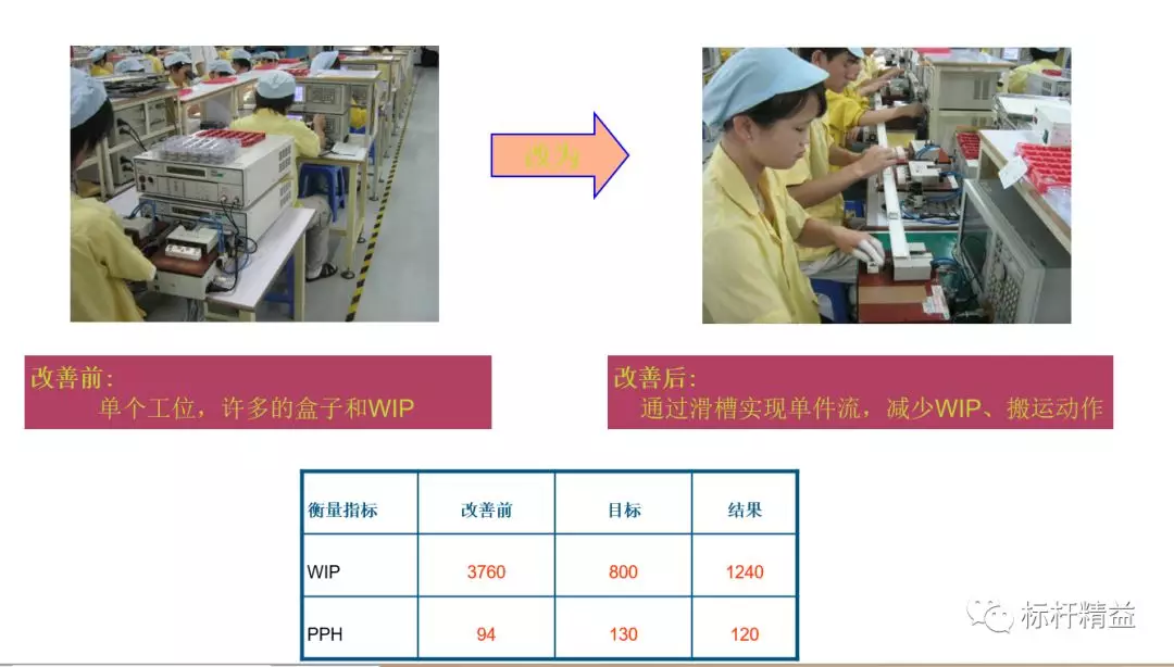 改進(jìn)生產(chǎn)力:許多伴隨批量生產(chǎn)而來的不增值作業(yè)通過單件流也隨即 消除。(如擺盤,搬運(yùn)等)
