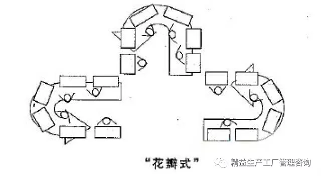花瓣型布局是由多個(gè)單元共同組成,是按照“兩個(gè)遵守、兩個(gè)回避”原則進(jìn)行布局的結(jié)果(兩個(gè)遵守即:逆時(shí)針排布、出入口一致;兩個(gè)回避即:孤島型布局、鳥籠型布局)。這種布局有助于提高單元間的互相協(xié)助,從而提高生產(chǎn)線平衡率。花瓣式布局是進(jìn)行“互助協(xié)作”的必要條件。
