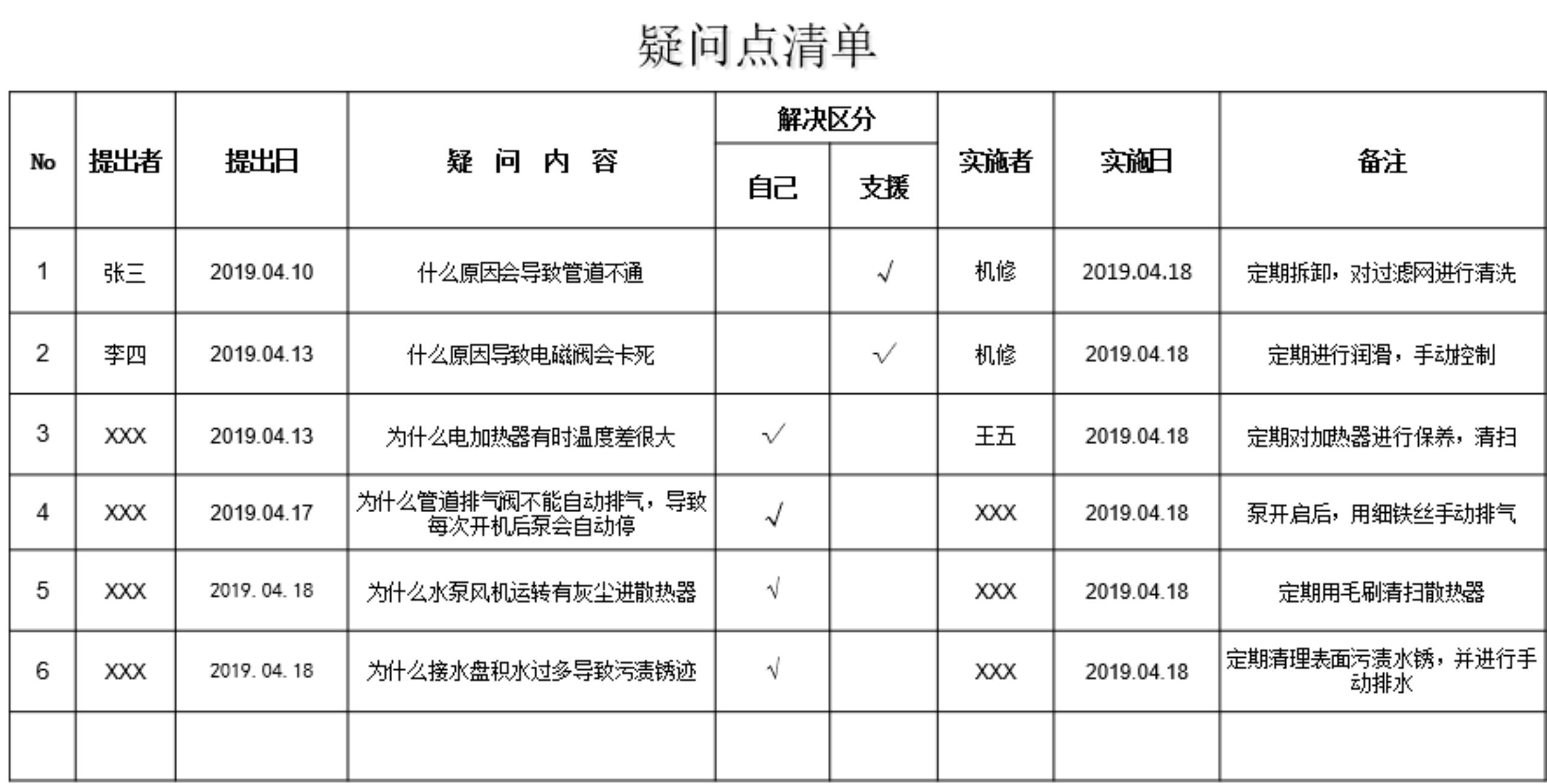 4)疑問點(diǎn)清單:活動(dòng)開展過程中對設(shè)備及各項(xiàng)不明白、不理解的,可以提出疑問,并由本部門人員或者其他部門人員進(jìn)行解答,以便促進(jìn)對設(shè)備的了解。