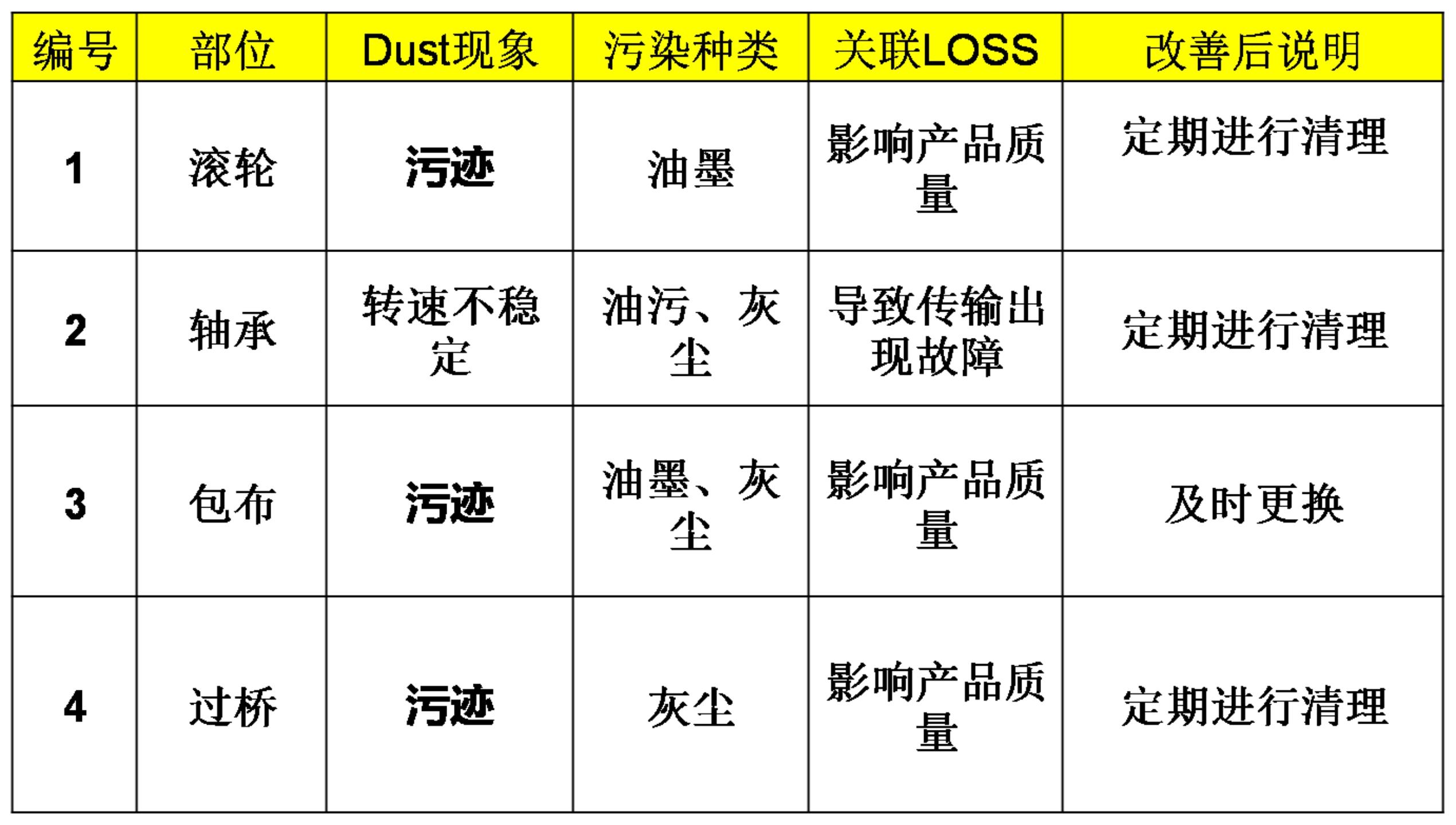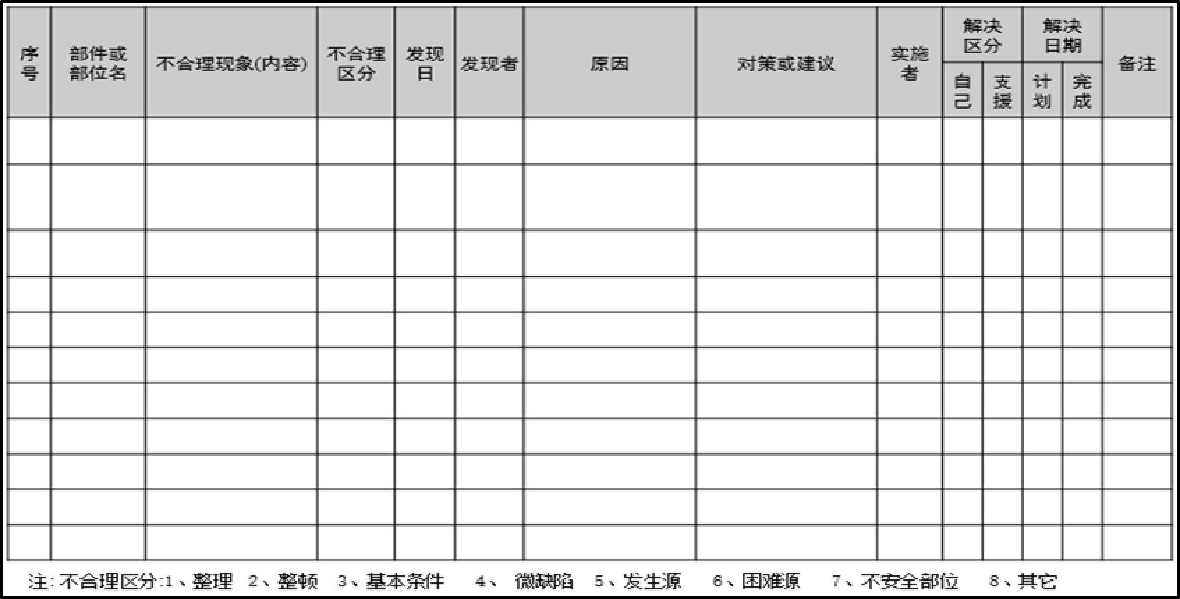 3)不合理點(diǎn)清單:清掃就是點(diǎn)檢,在設(shè)備清掃的過程中發(fā)現(xiàn)設(shè)備的各項(xiàng)不合理問題點(diǎn),并進(jìn)行改善。