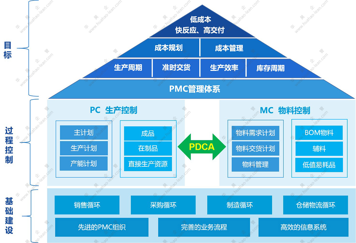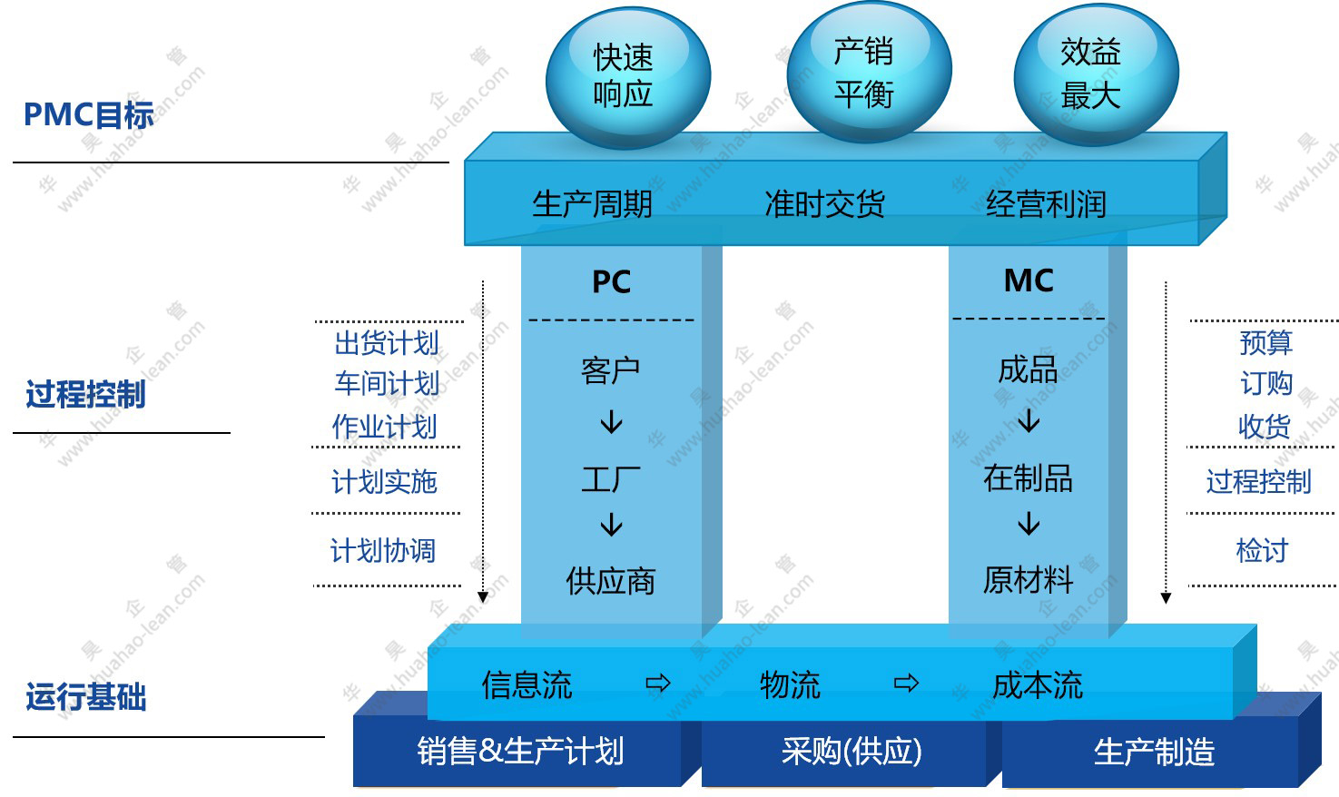 精益計(jì)劃物控PMC(Lean—Plan & Material Control)是指基于精益思想的計(jì)劃、協(xié)調(diào)及控制生產(chǎn)系統(tǒng)內(nèi)部資源,以實(shí)現(xiàn)生產(chǎn)資源利用最大化及快速響應(yīng)客戶要求的目的,進(jìn)而為企業(yè)帶來(lái)收益。其主要有兩方面的工作內(nèi)容:即PC(生產(chǎn)計(jì)劃、生產(chǎn)進(jìn)度的管理)與MC(物料的計(jì)劃、采購(gòu)、跟蹤、收發(fā)、存儲(chǔ)、使用等各方面的監(jiān)督與管理,以及廢料的預(yù)防與處理工作)。它是企業(yè)內(nèi)部供應(yīng)鏈,是基于對(duì)企業(yè)內(nèi)部的實(shí)物流、信息流、資金流(內(nèi)部成本流)進(jìn)行計(jì)劃、協(xié)調(diào)及控制,是圍繞企業(yè)內(nèi)部進(jìn)行管理,是局部的供應(yīng)鏈。
