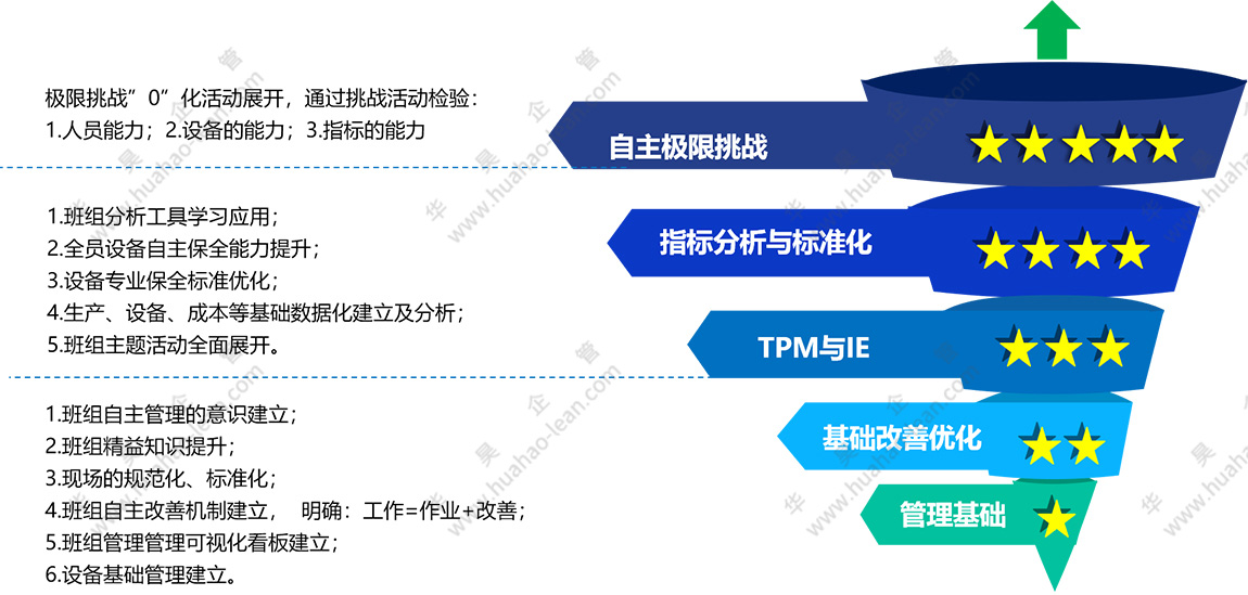 班組是企業(yè)的最小經(jīng)營單位,每個班組的管理水平及經(jīng)營能力決定企業(yè)的制造競爭力。精益五星班組管理是從高效生產(chǎn)、完美品質、成本控制、現(xiàn)場管理、團隊建設的五個方向上進行系統(tǒng)改善與提升,同時打造充滿革新活力的組織文化,實現(xiàn)客戶、員工、企業(yè)三贏目標的精益管理體系。其關鍵是通過“一個中心”、“三個文化”、“五個全員”的建設,以全面提高班組的管理水平,不斷強化企業(yè)的核心競爭力。其中“第五級班組建設”實現(xiàn)的是企業(yè)與人的共同成長,所以它不是某個部門的事,它是企業(yè)的戰(zhàn)略工程、使命工程、責任工程,更是系統(tǒng)工程。